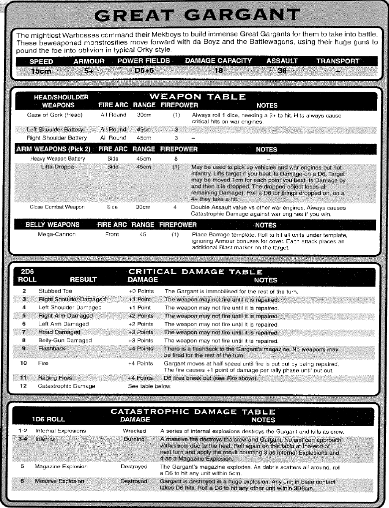 As with flak I don't think super heavy tanks such as Baneblades, Shadowswords and Ork battlefortresses are worthwhile enough at the moment. Their points cost doesn't really equate well with their vulnerability — Criticals vaporize them so easily that having a Death Ray in the opposing force means they will disappear within a couple of turns; even Firepower is quite capable of taking out super heavy tanks relatively easily because of the large number of dice you get to roll. War engine orders will help to an extent but the main problem is the critcals. Try the new Critical Damage table for Baneblades, Shadowswords and Ork Battle Fortresses.